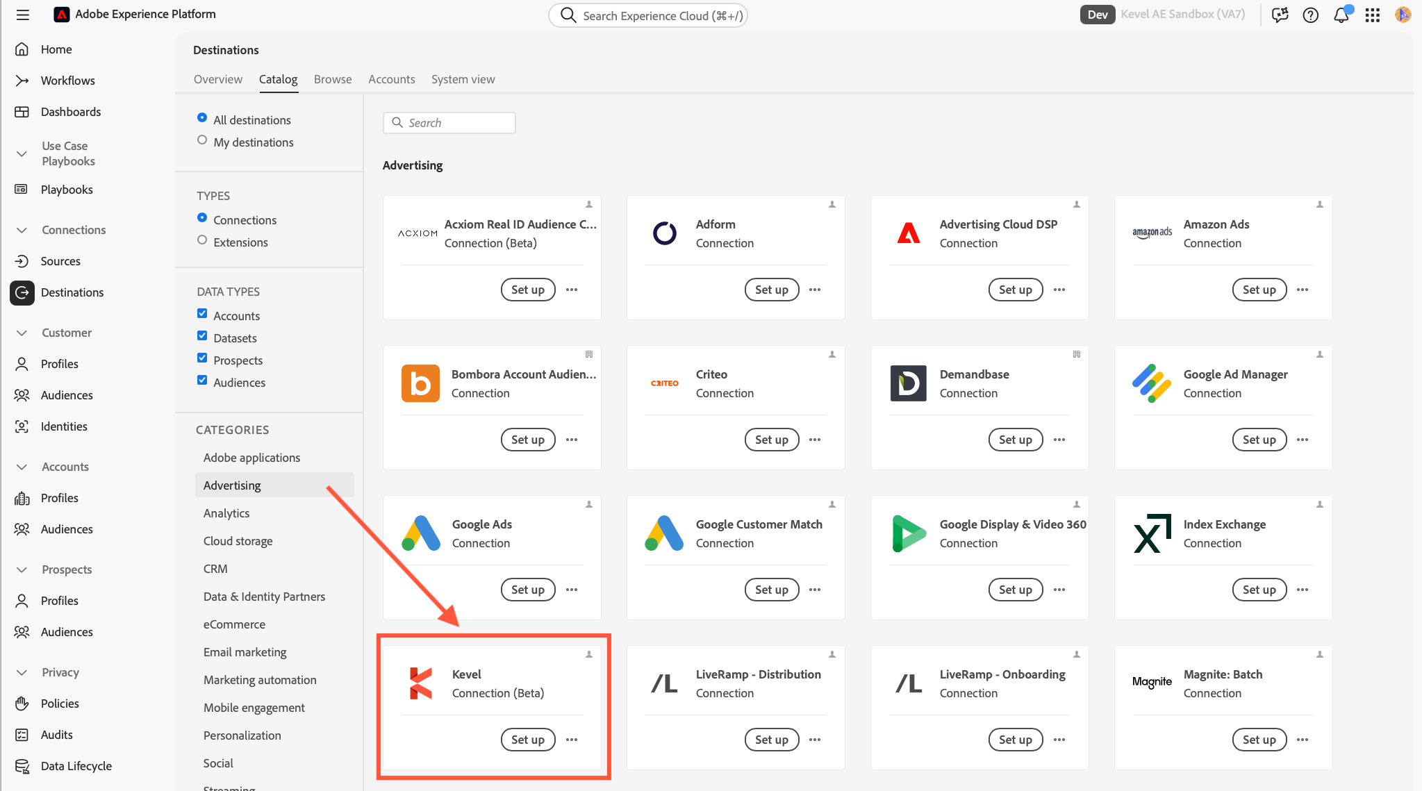 Adobe Experience Platform (AEP) Destination – Kevel now supports a native destination for Adobe Experience Platform, allowing customers to sync AEP audiences into Kevel for targeting and automatically resolve audience membership at ad decision time using Kevel’s UserDB. This enables tighter integration between CDP-managed audiences and Kevel campaign delivery. View the destination documentation for more details.