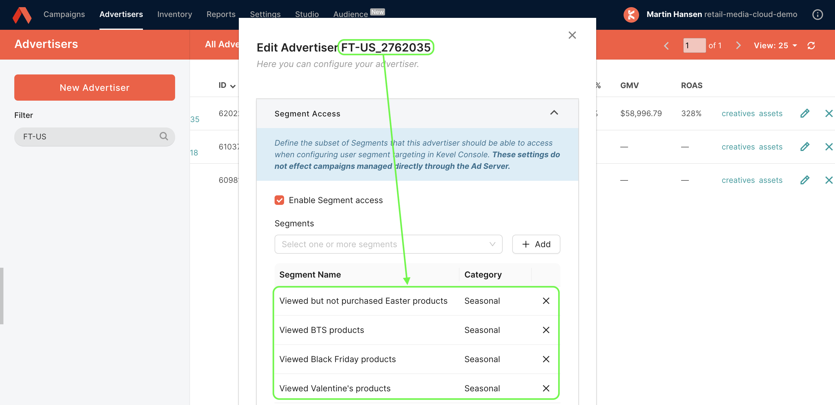 Update the audience segments that should be advertiser-specific in the Kevel Management UI or API.