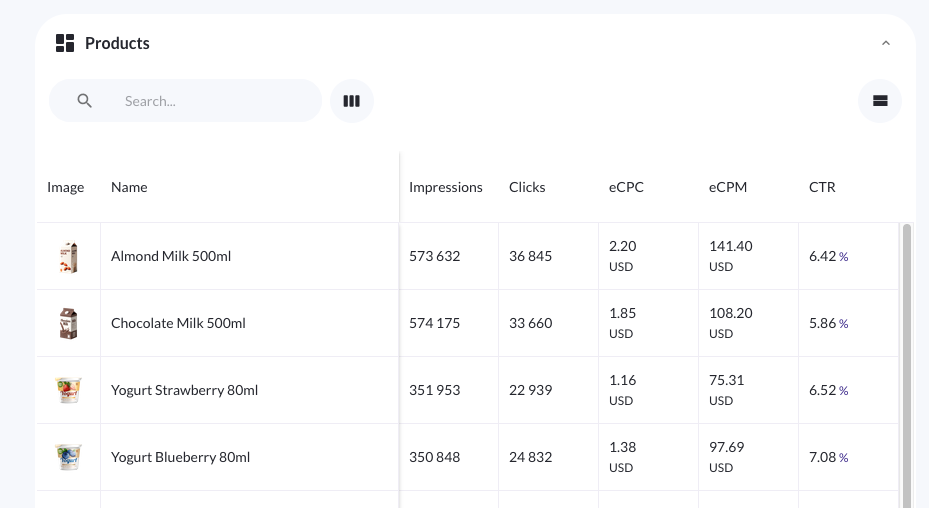 Campaign-level product performance reporting – For product ad and native product ad type campaigns created in Console, the product stats tab within the individual campaign dashboard gives campaign managers a detailed view of how specific promoted products are performing within a campaign. It combines metrics with contextual product details — including image and name — in a single table. The tab supports custom date ranges within the campaign's duration, column visibility management, and column sorting, making it straightforward to isolate over- and under-performing products. Learn more about campaign-level product performance reporting in Console.c
