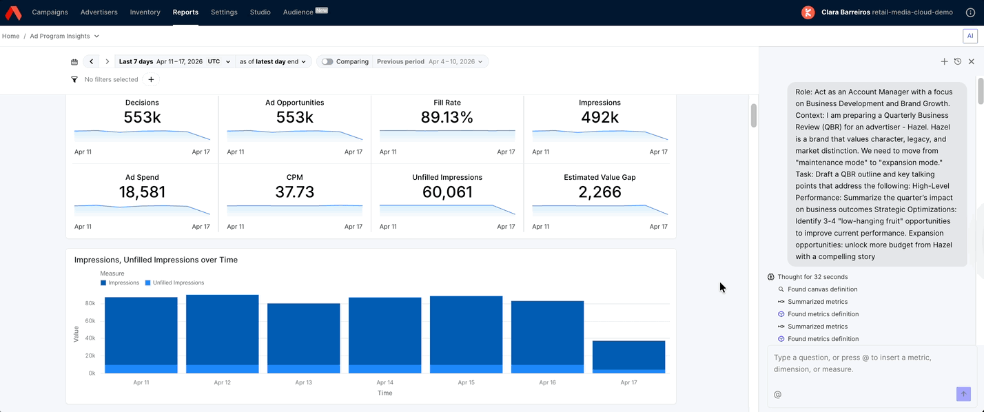 - Demand concentration monitoring. Spot when too much of your revenue depends on a single advertiser — and use the AI to think through how to diversify. Track quarter-over-quarter advertiser count and spend distribution.
