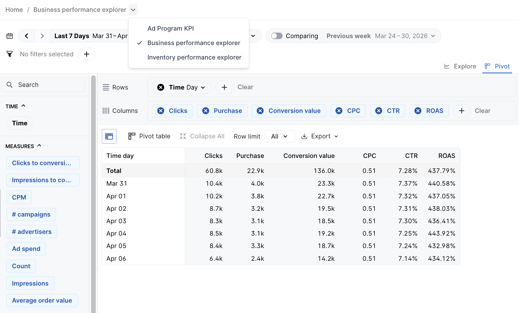 - Business performance and Inventory explorers. Build your own pivot tables. Slice any combination of metrics — ad spend, ROAS, CTR, conversions — by advertiser, site, zone, ad type, or channel. Export what you need.