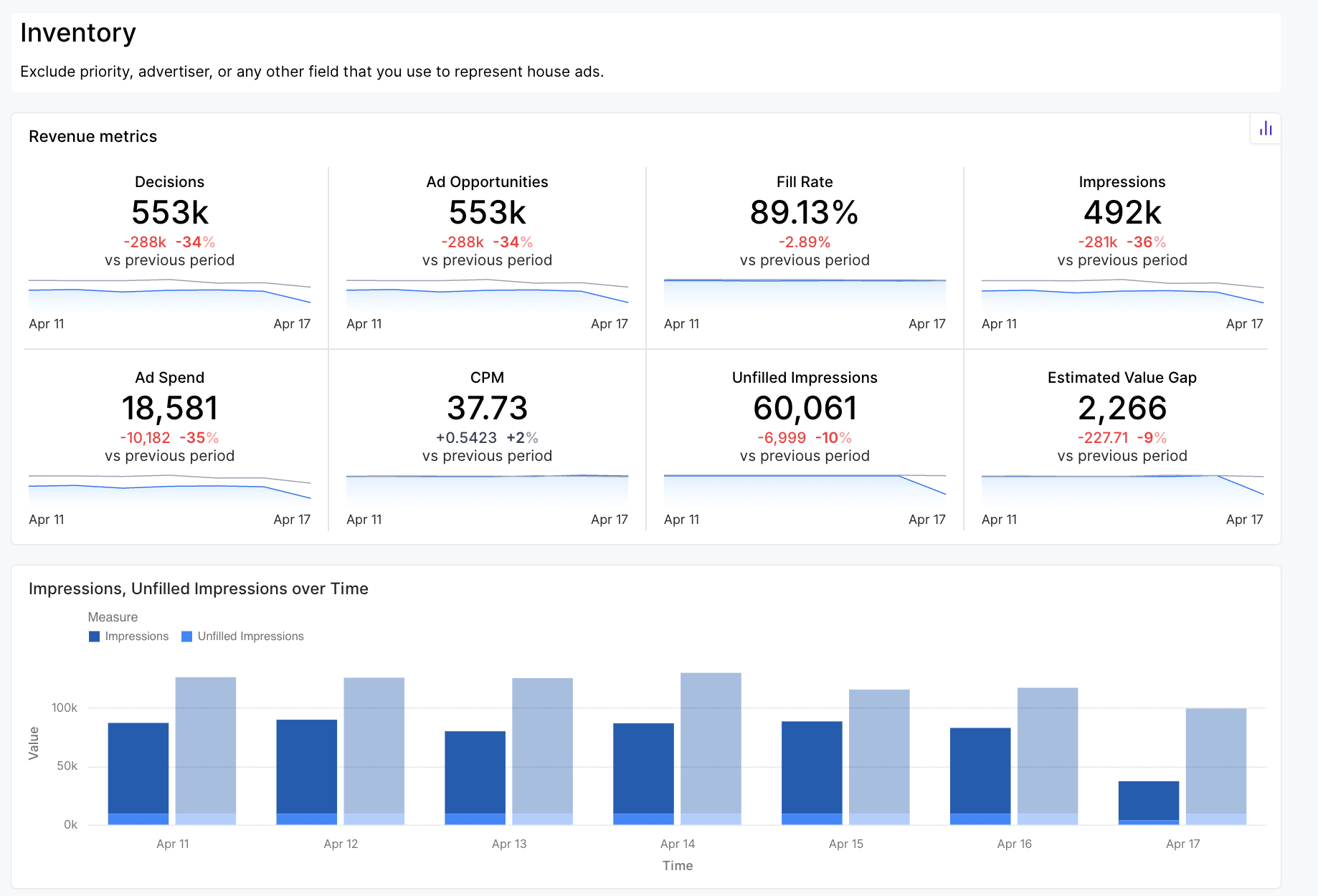 - Inventory. Impressions, fill rate, ad opportunities, unfilled impressions, decisions, CPM over time and estimated value gap. Understand the health and utilization of your ad inventory at a glance.