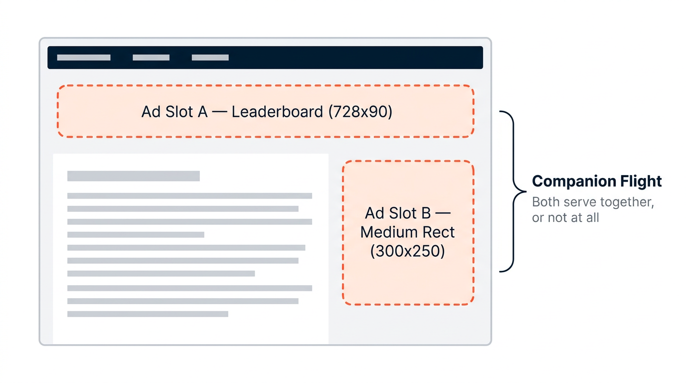 Companion ads are all-or-nothing: every ad in the companion flight must be matched to a compatible placement, or none will serve. Do not rely on ad-level targeting rules (e.g., day parting) to reduce the number of companions that need to be matched. Instead, ensure your companion flight has no more ads than there are compatible placements in the request.