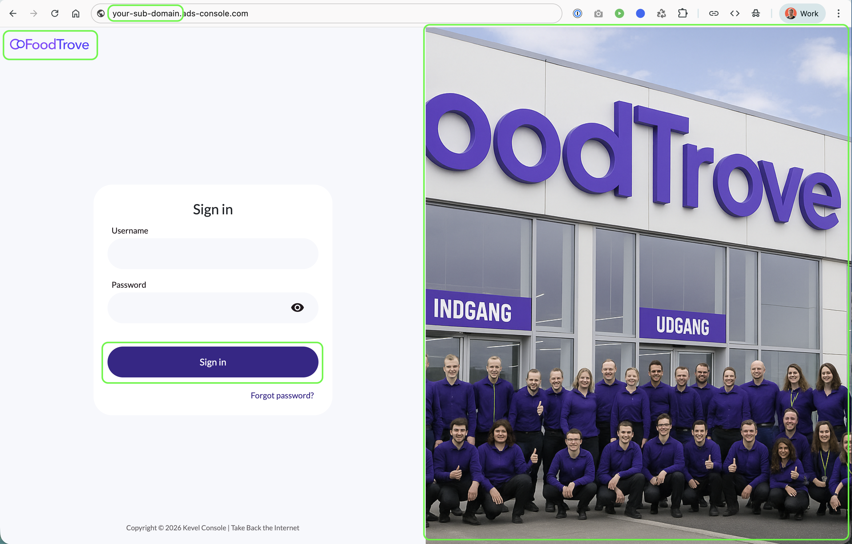Once enabled, your branded experience will appear on the login page, allowing advertisers to sign in using your custom subdomain or domain.