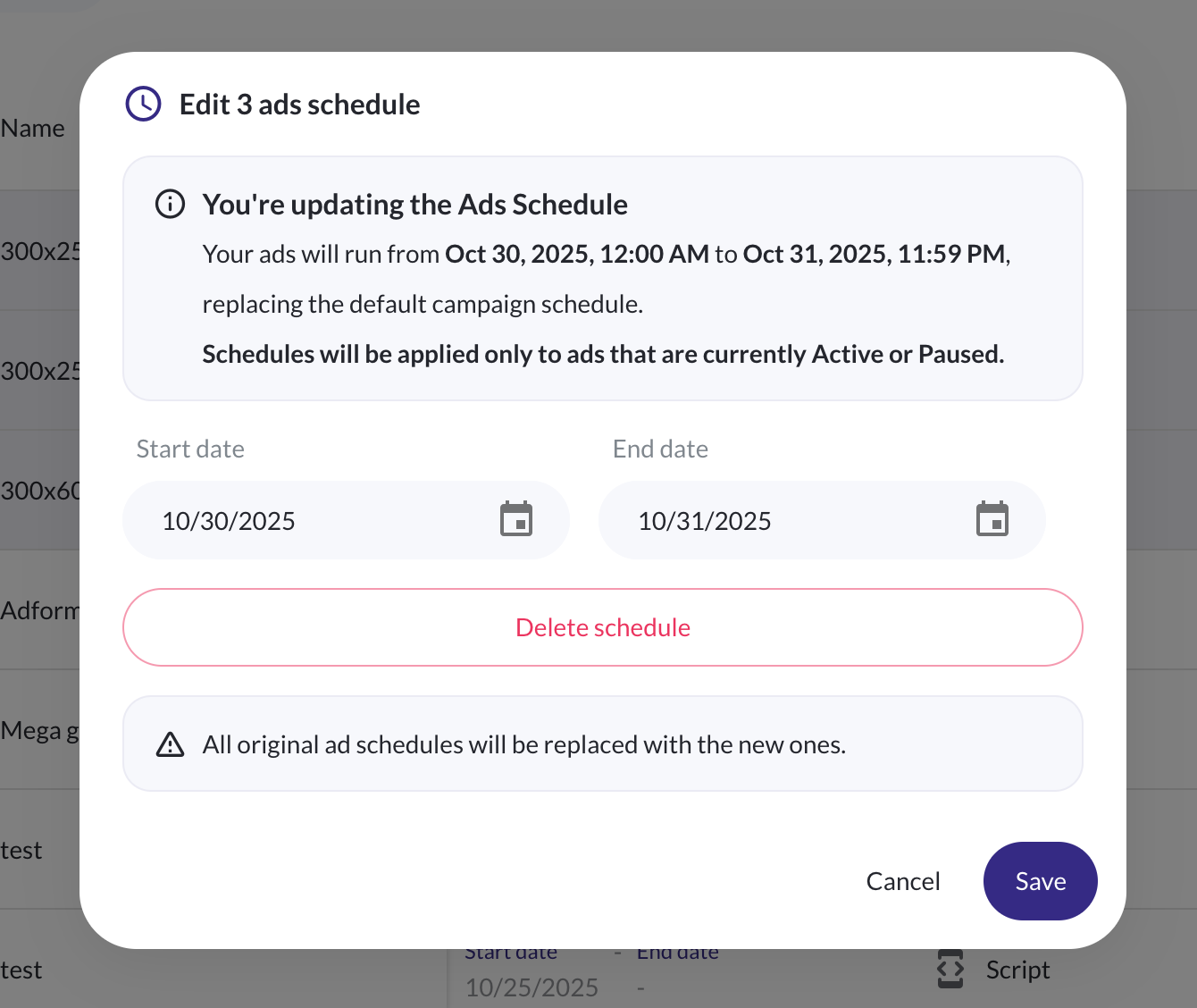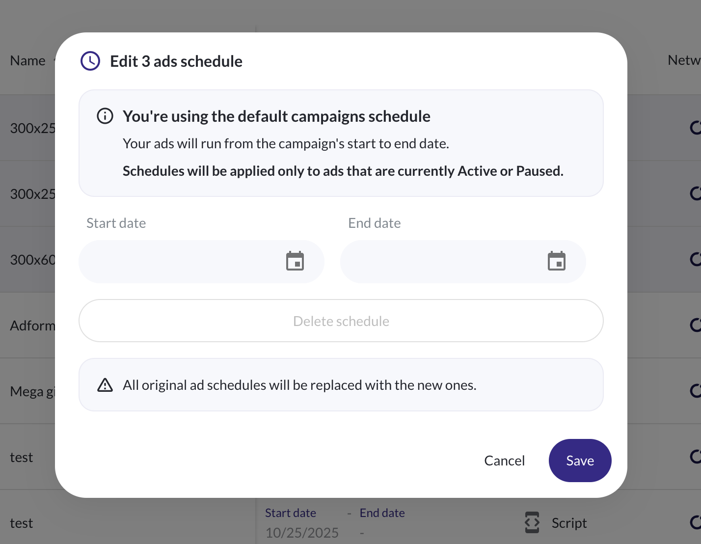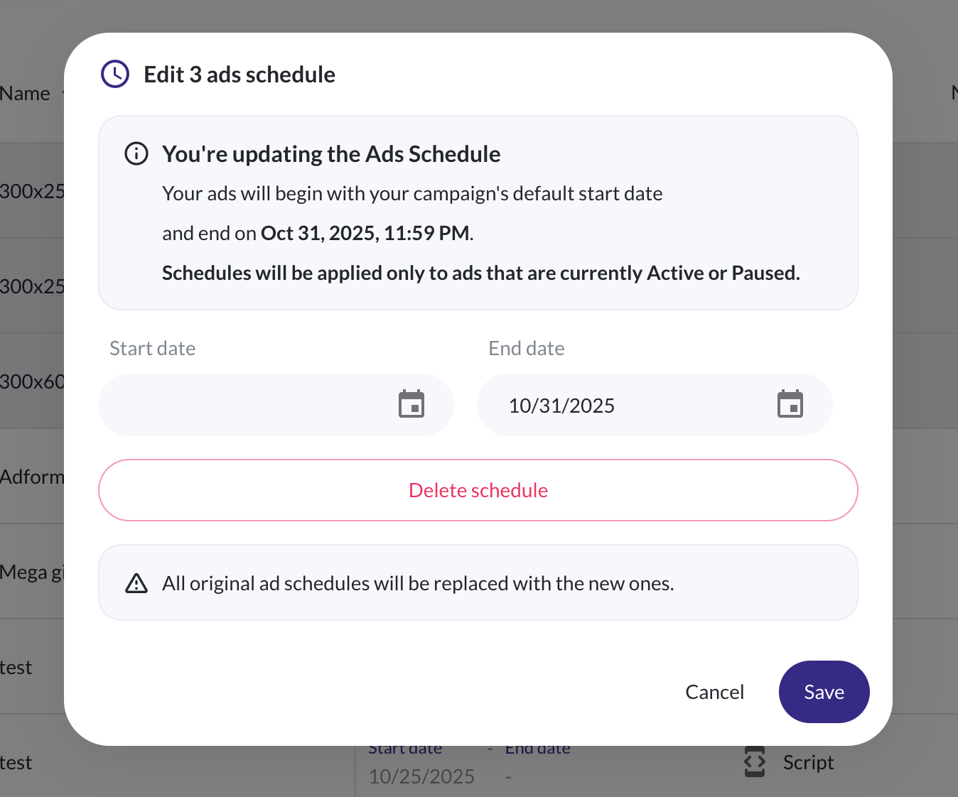 From the campaign’s ad list, you can also edit individual ad schedules directly - perfect for quick adjustments without reapplying a bulk change.