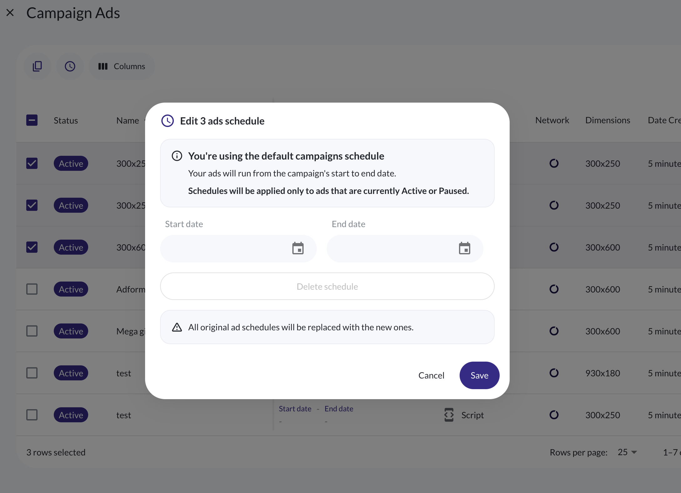 - A pop-up will appear allowing you to define the start and end dates for the selected ads.