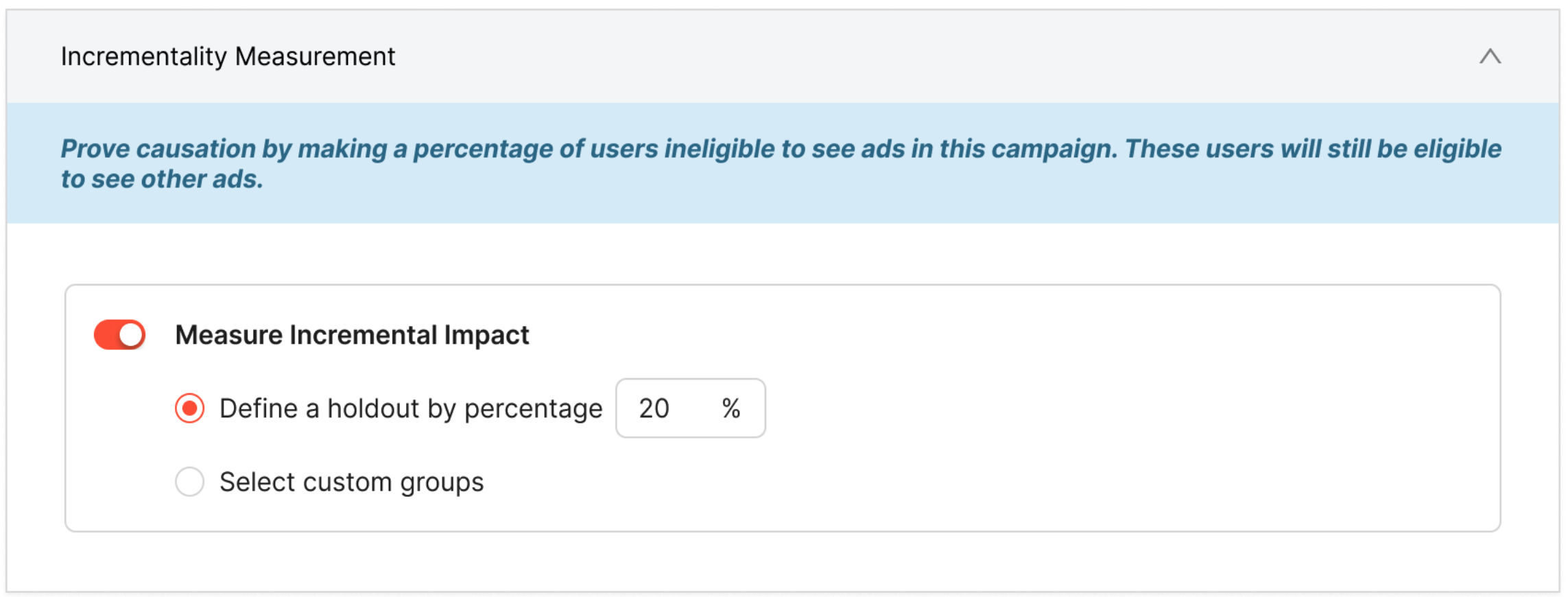 When enabling incrementality for a campaign, choose how users will be split into test vs. control: