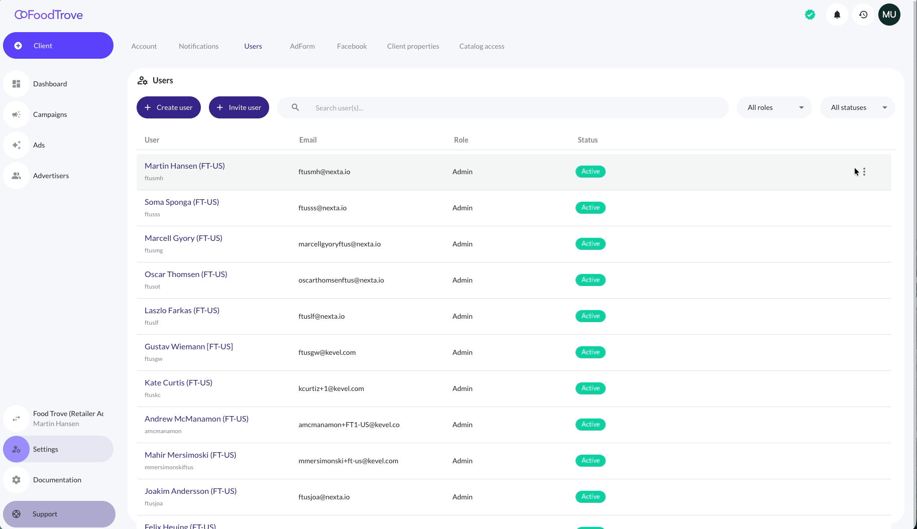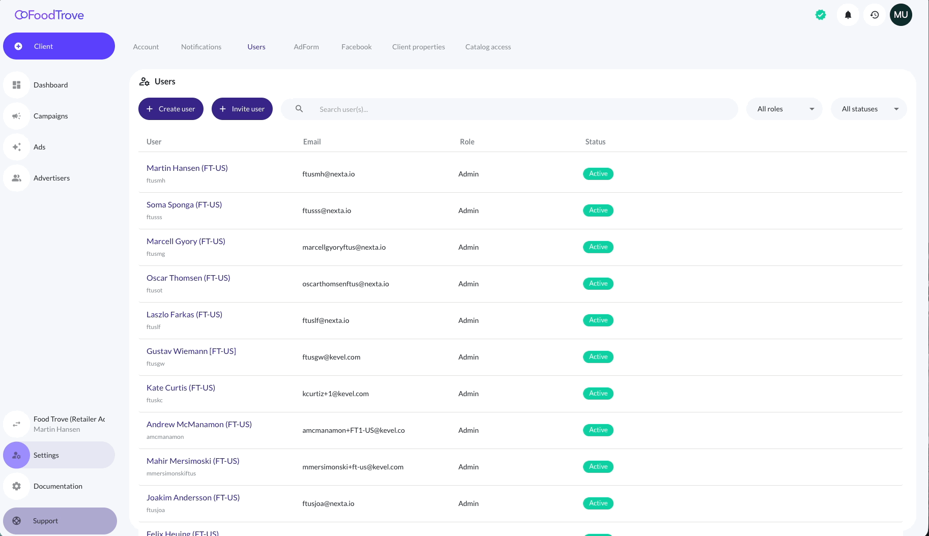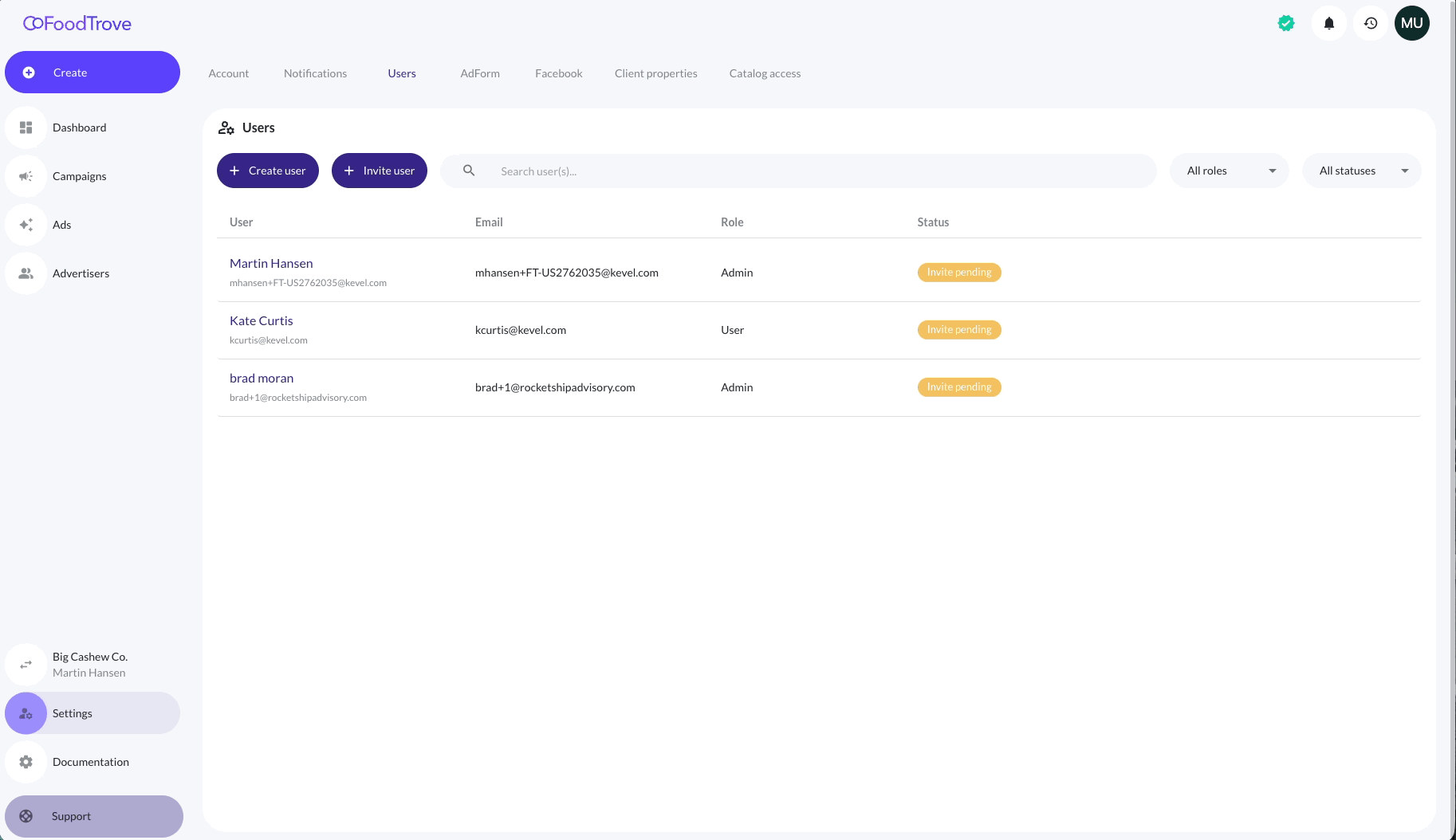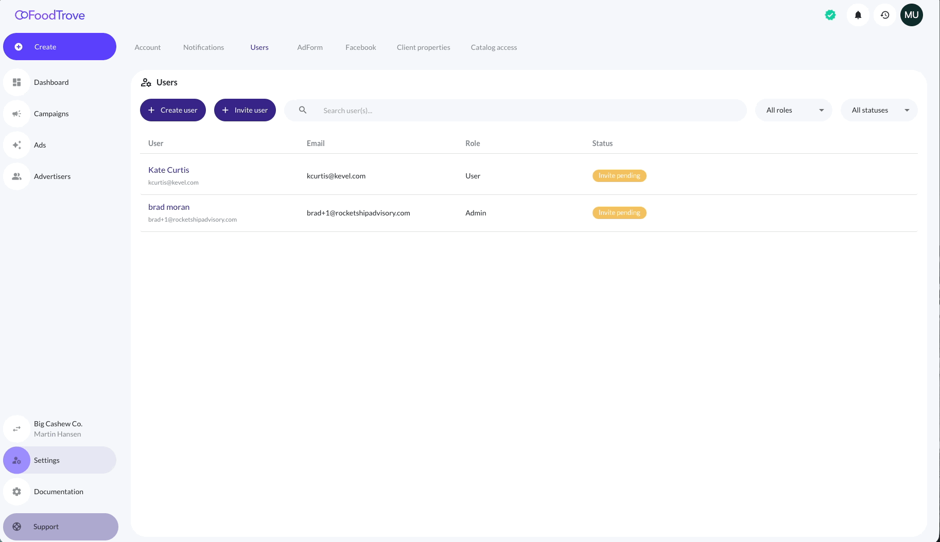 User access is managed per advertiser account through Settings.