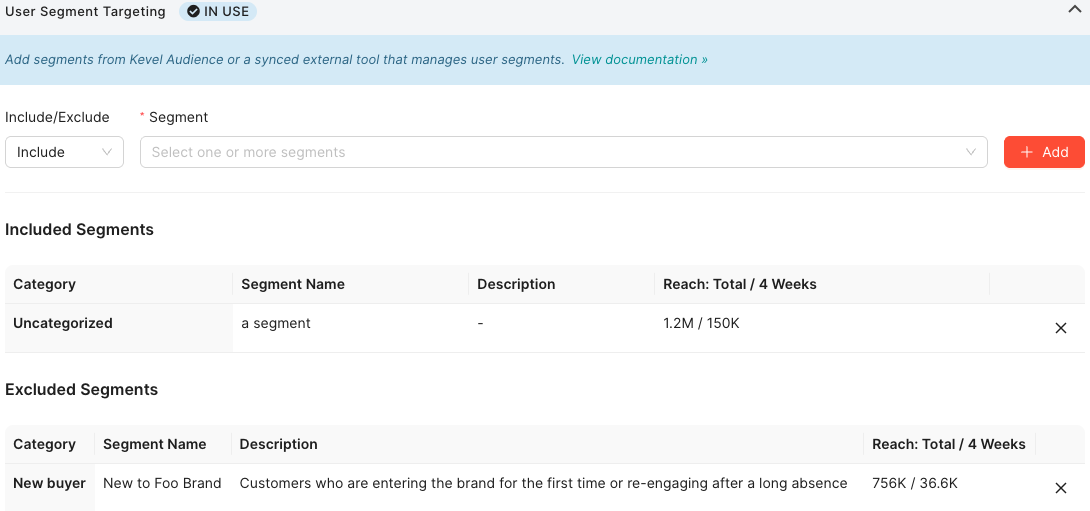 In the Kevel ad server UI, when user segment targeting is enabled for your network, you will see a "User Segment Targeting" module when creating or editing a flight. Here, you can include or exclude one or more segments.