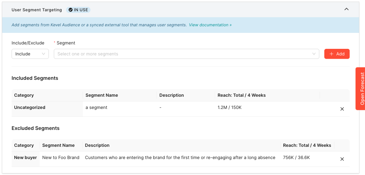 - Segments must be saved in the Kevel system and their IDs must match the Kevel records in order to be eligible for matching based on targeting or bid modification.