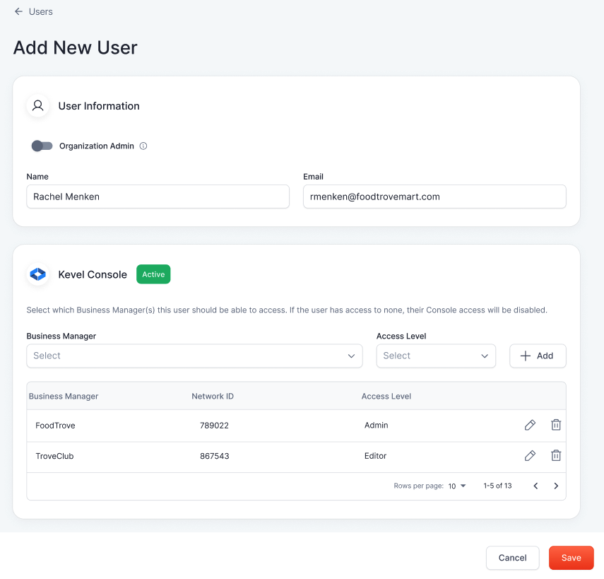 This page shows all users in your Kevel account, across all Kevel products you have access to.