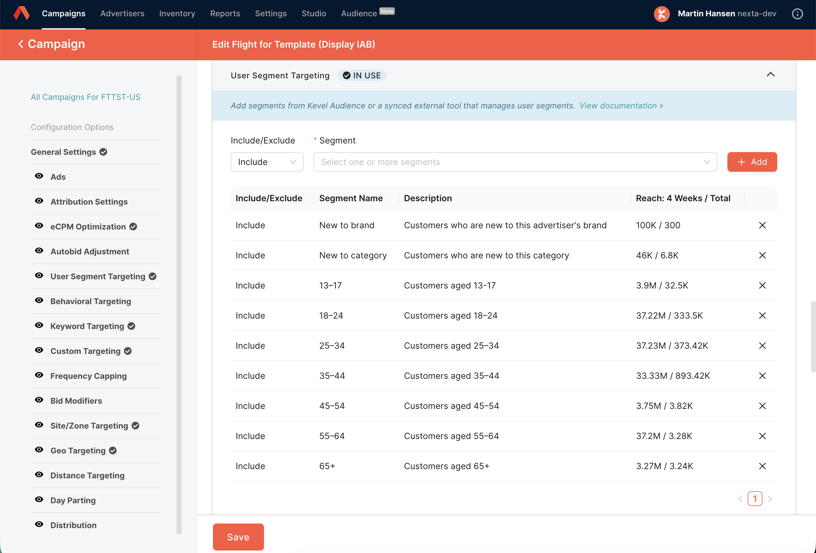 Here you can read about how to get User segments from Kevel Audience into the managementUI on your network.